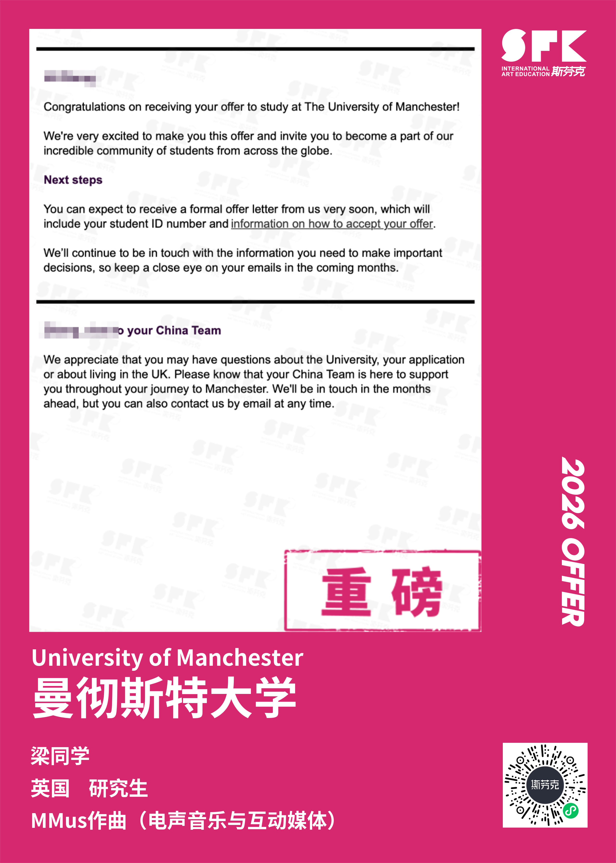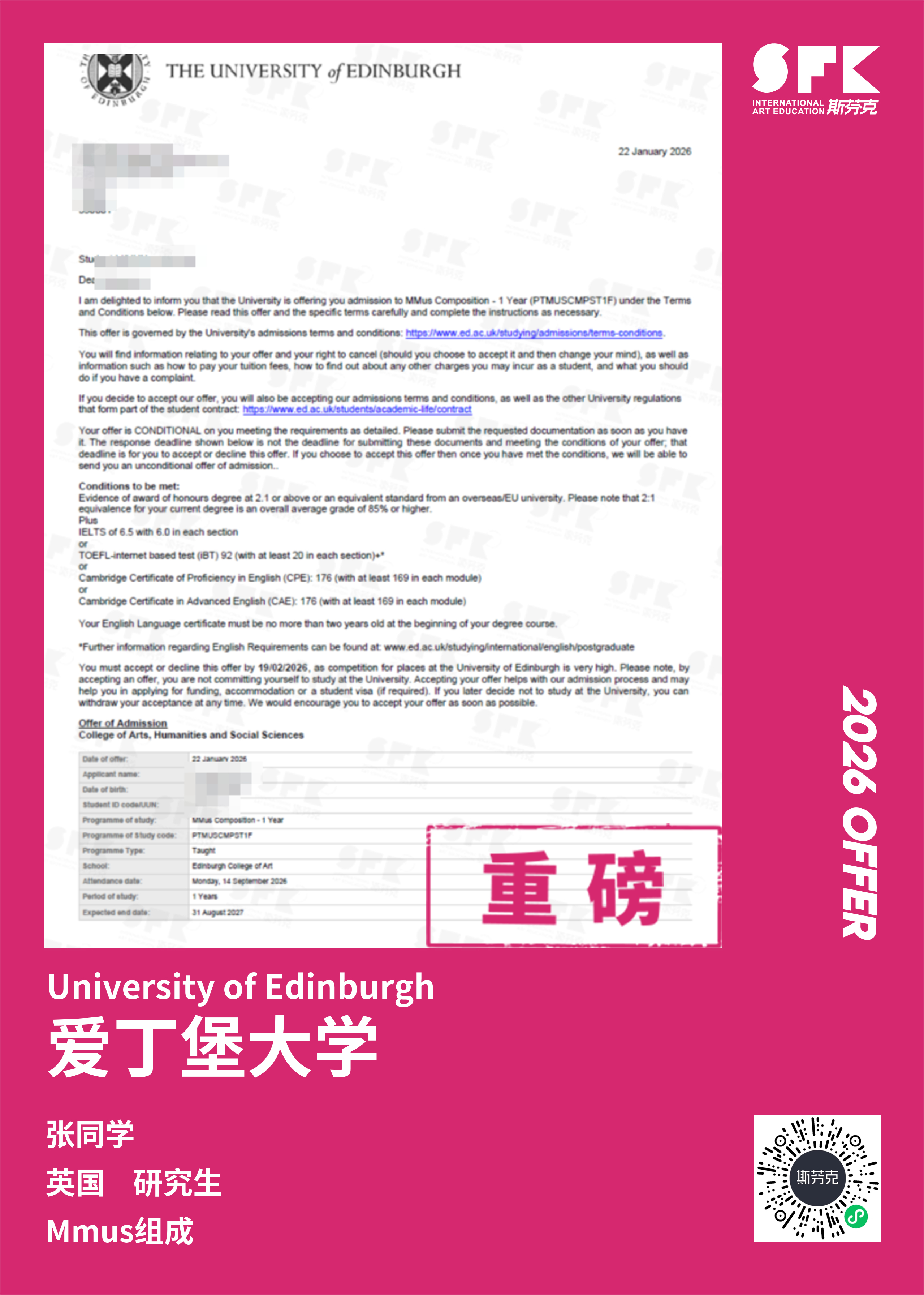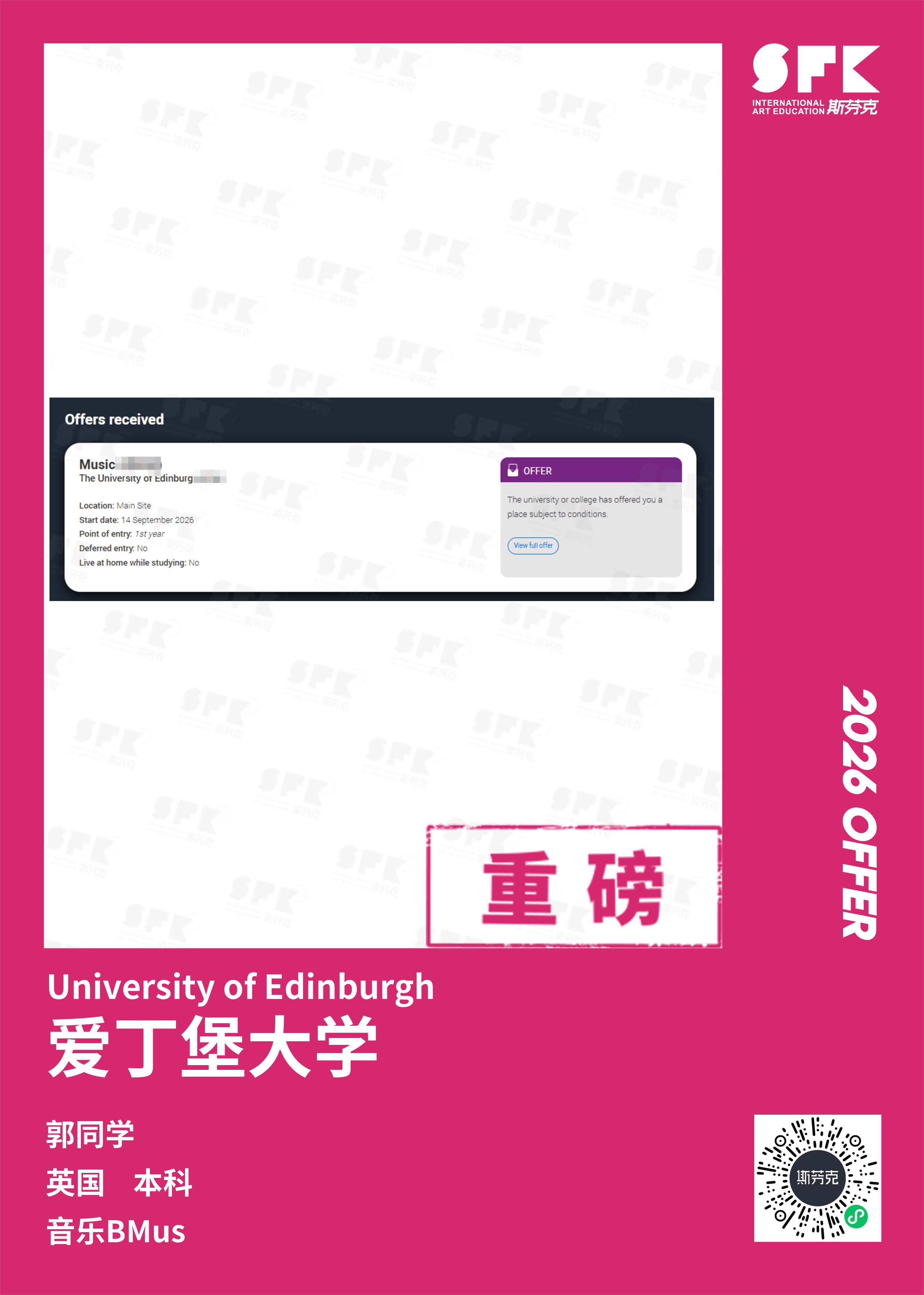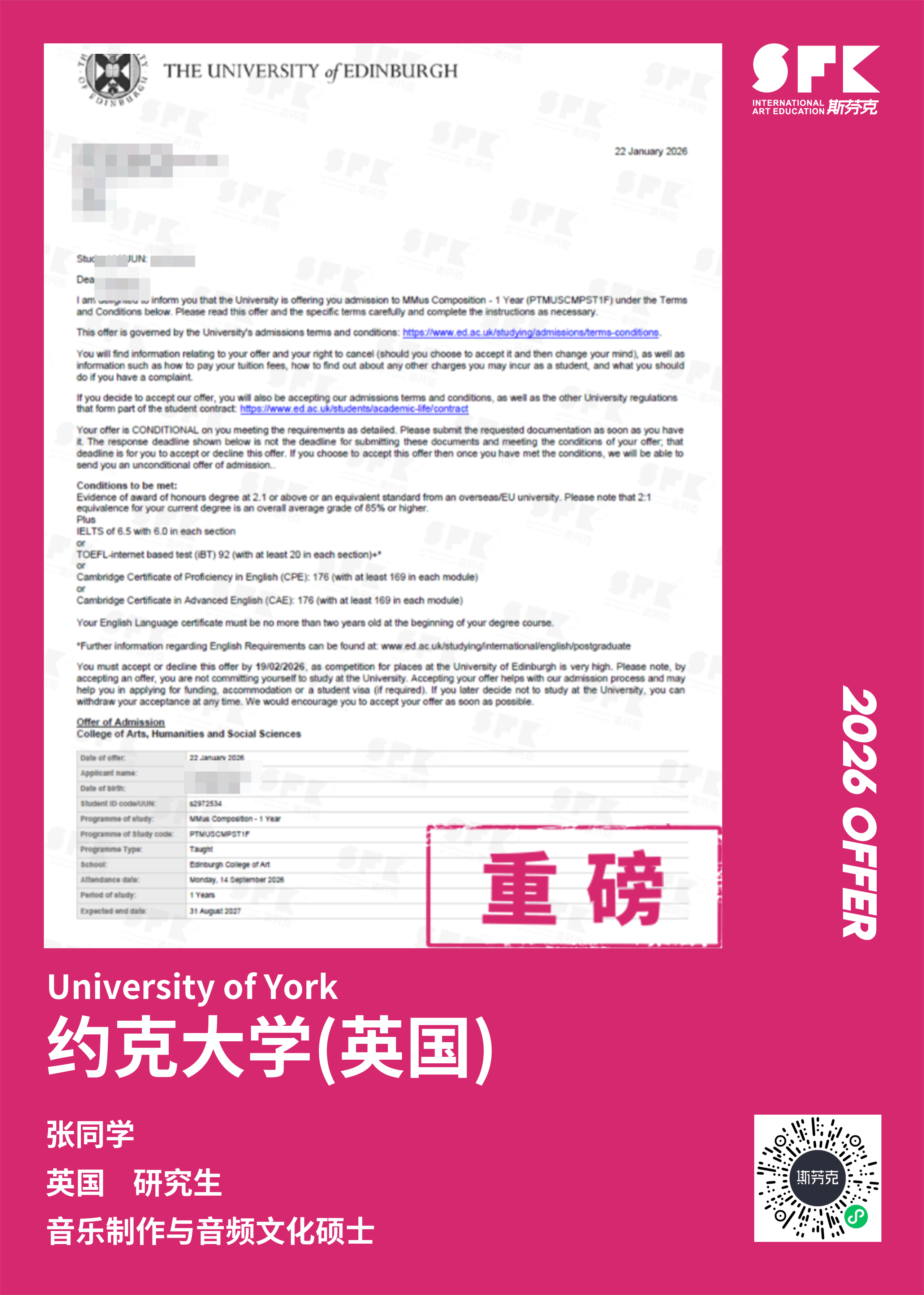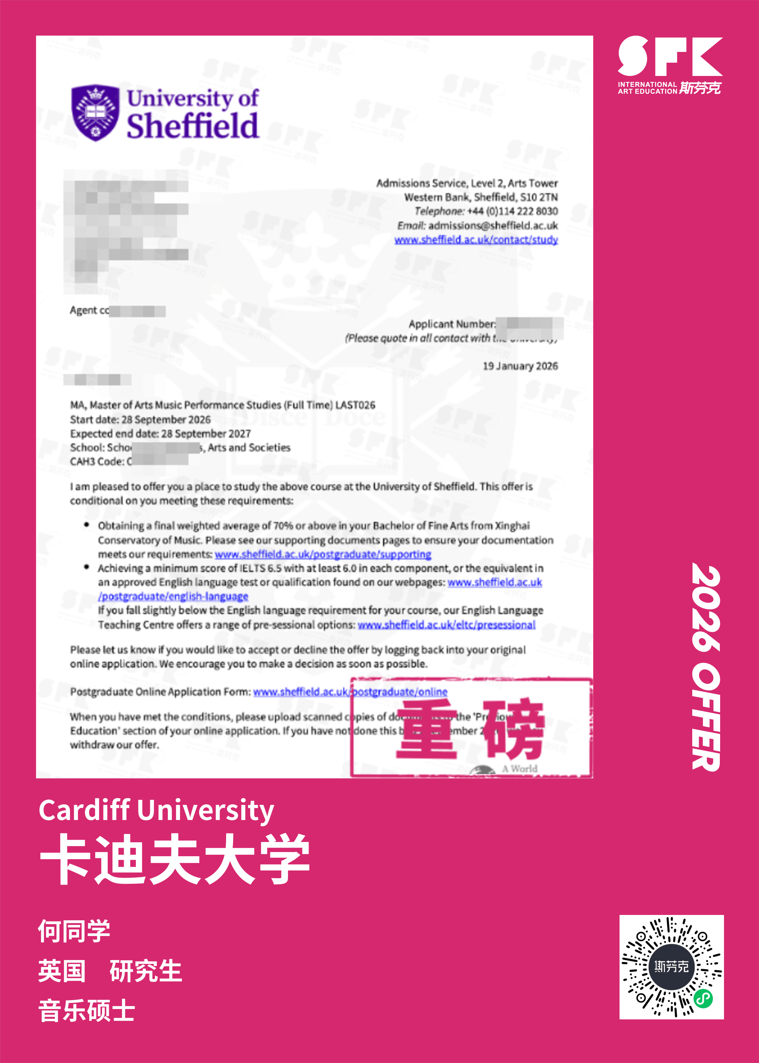 学生背景:MiraclE 22申请季 音乐科系学员 目前录取院校:皇家伯明翰音乐学院,约翰霍普金斯大学,爱丁堡大学,威斯敏斯特大学,伦敦大学金史密斯学院