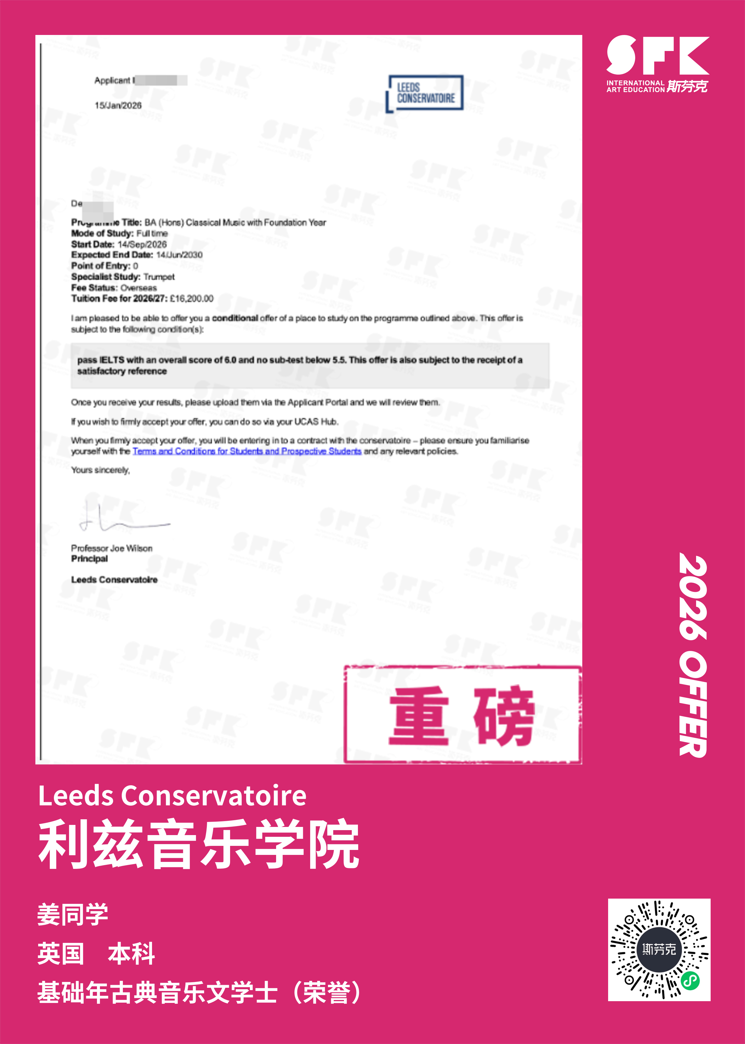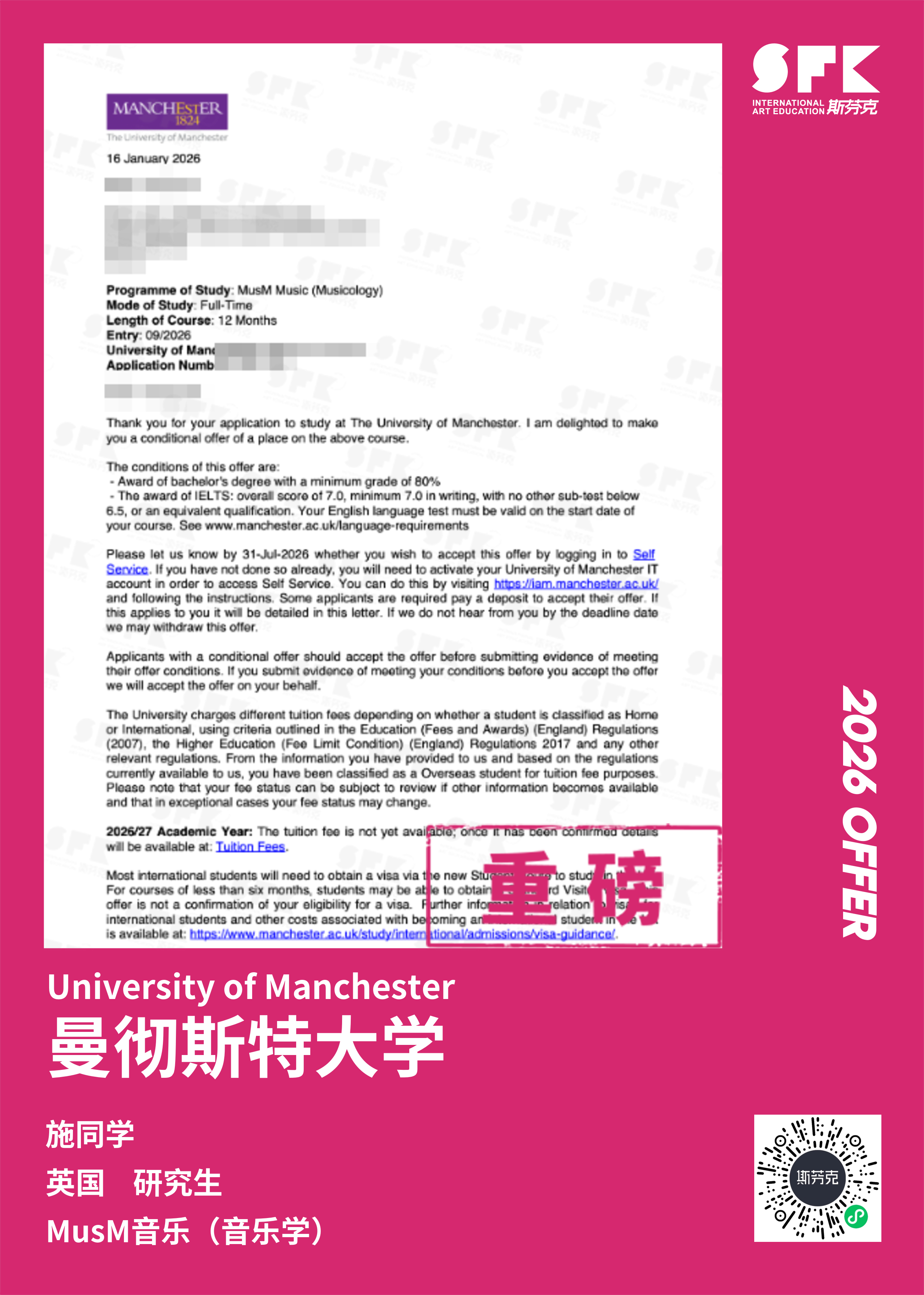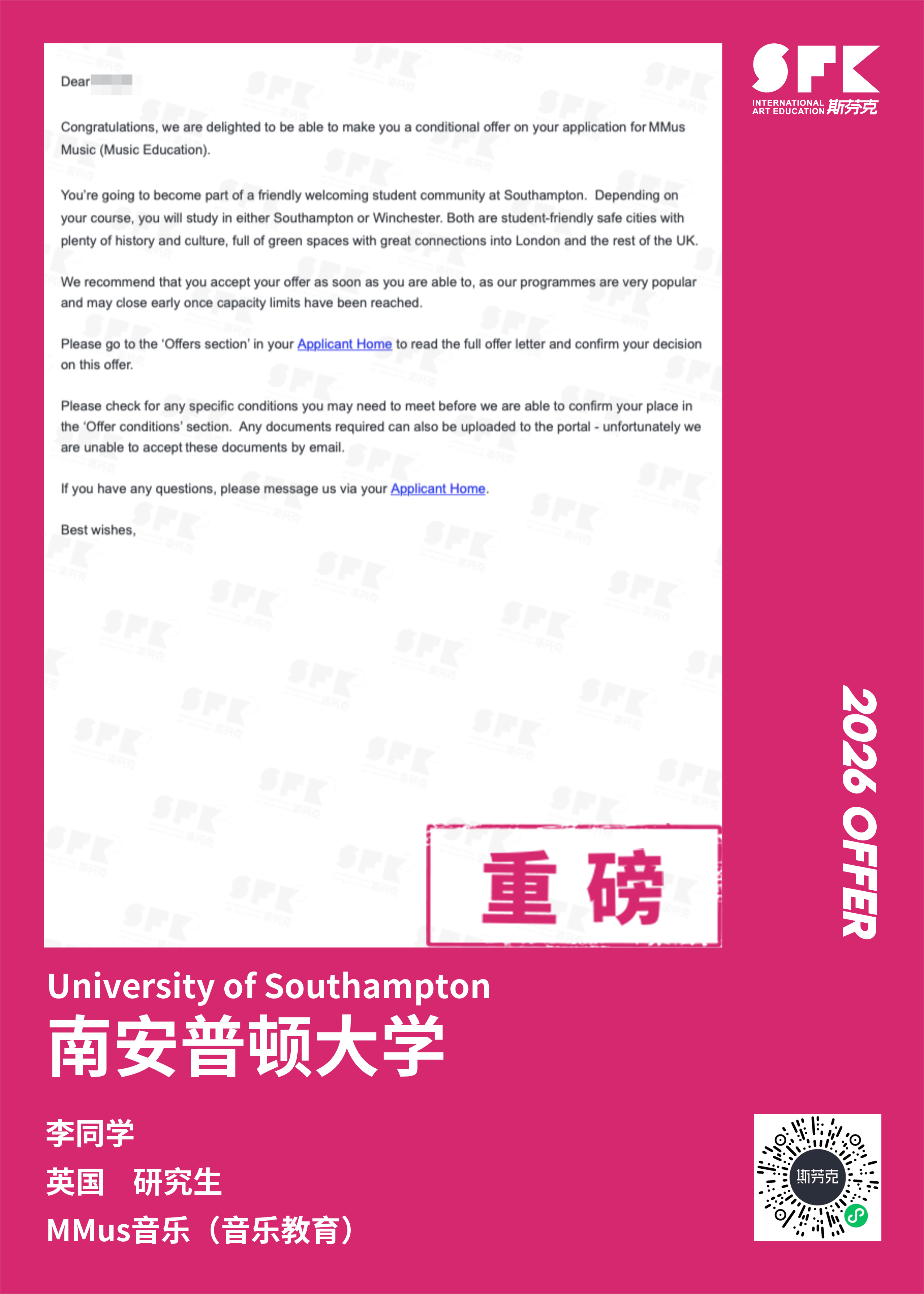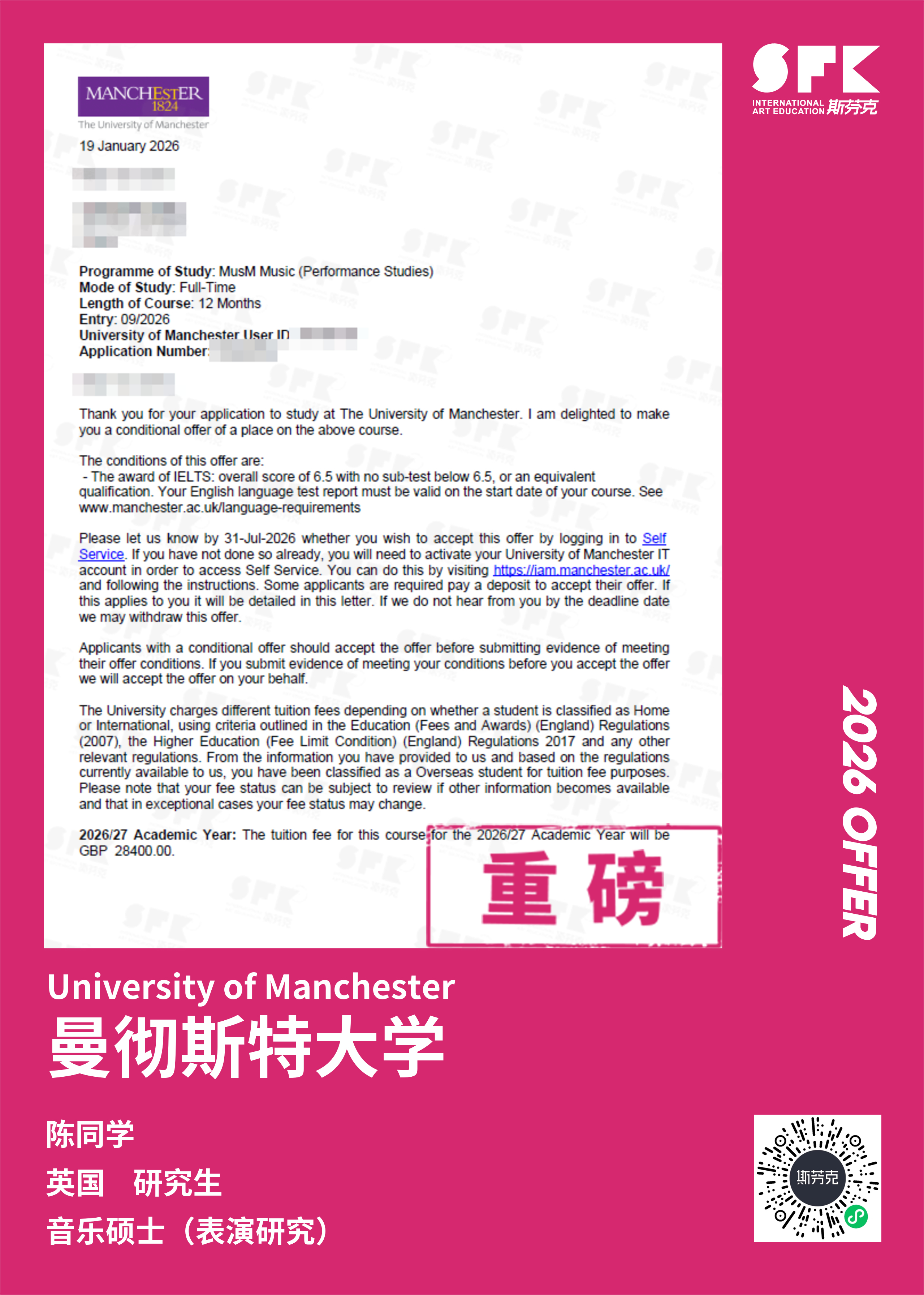 学生背景:MiraclE 22申请季 音乐科系学员 目前录取院校:皇家伯明翰音乐学院,约翰霍普金斯大学,爱丁堡大学,威斯敏斯特大学,伦敦大学金史密斯学院