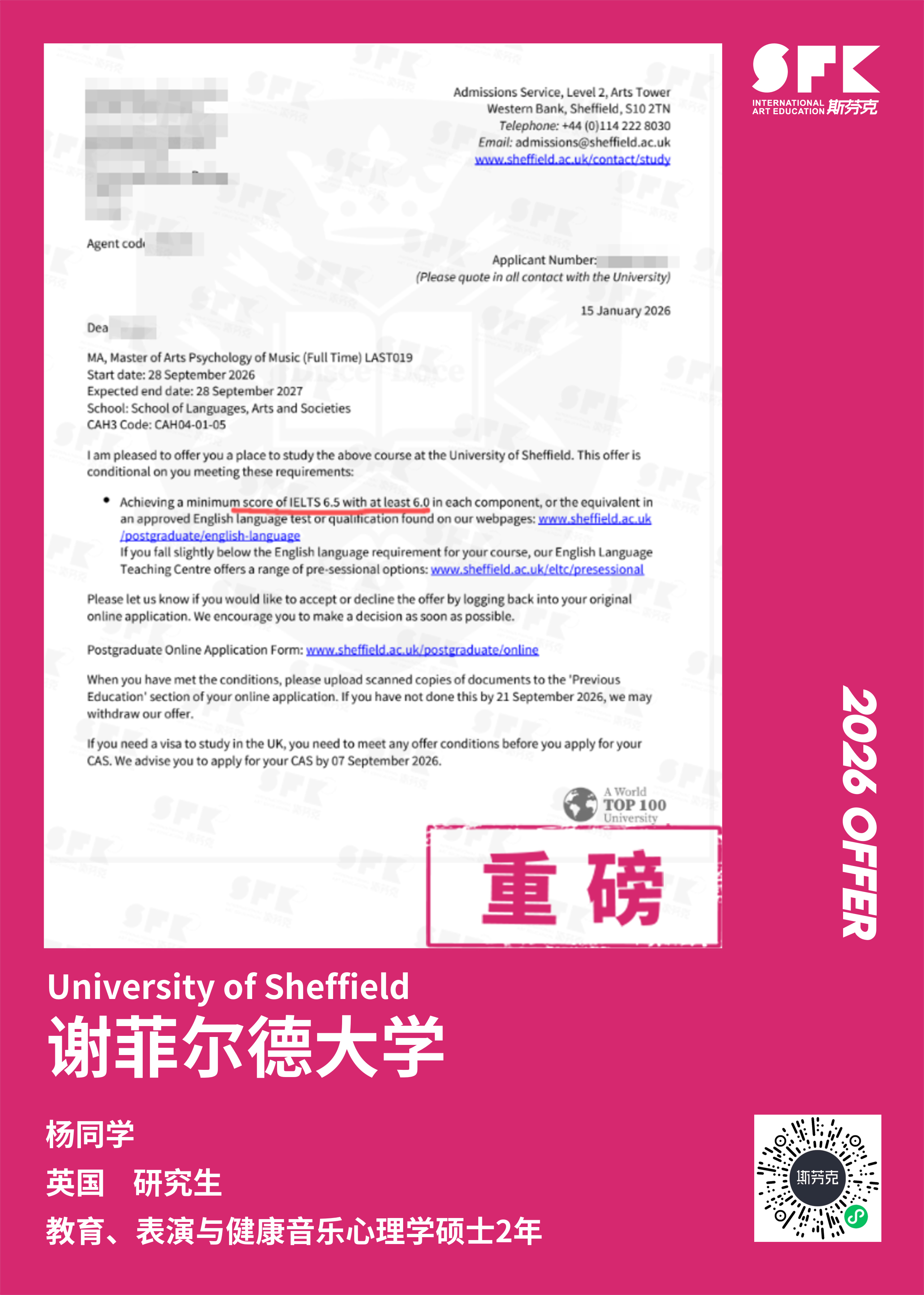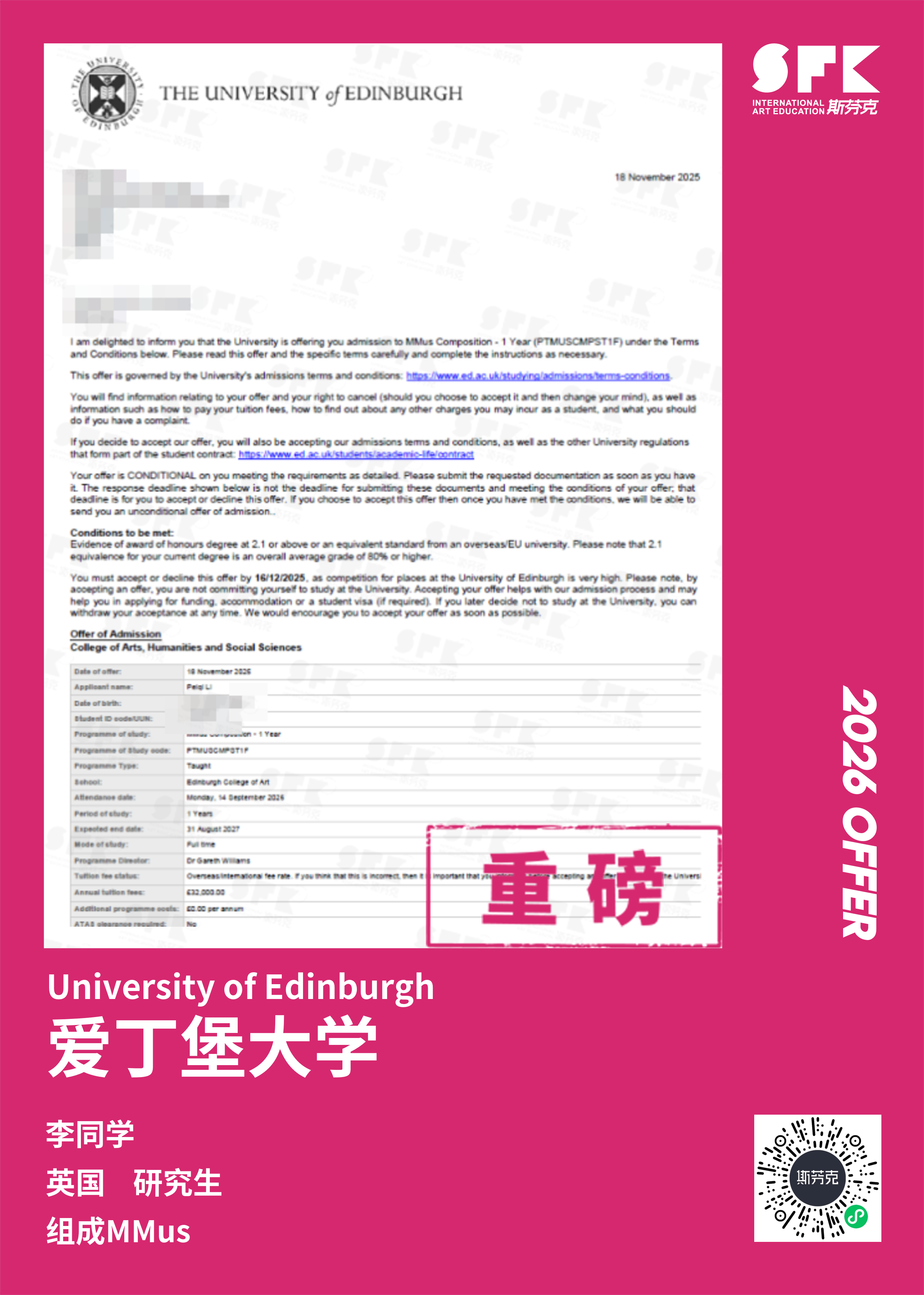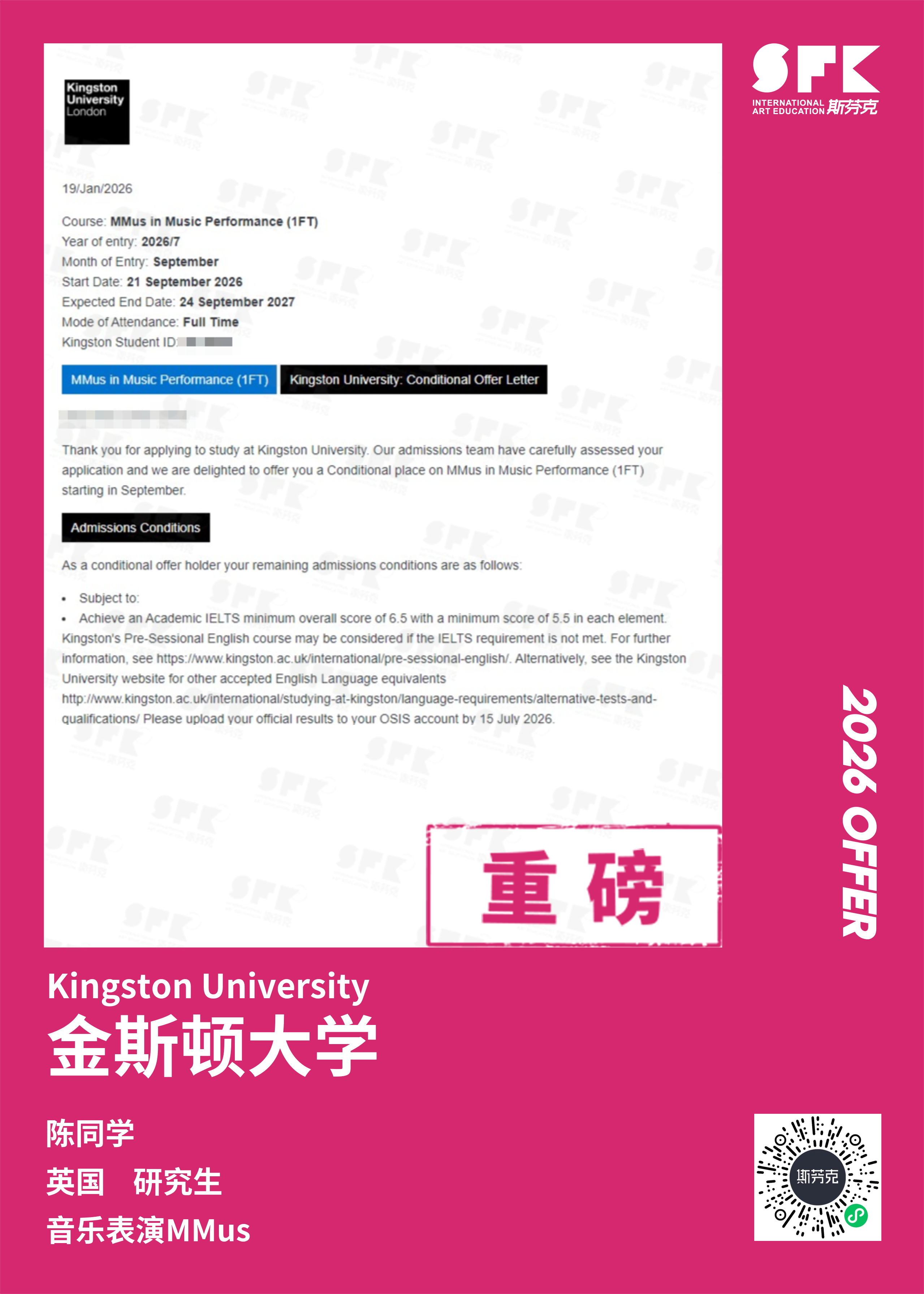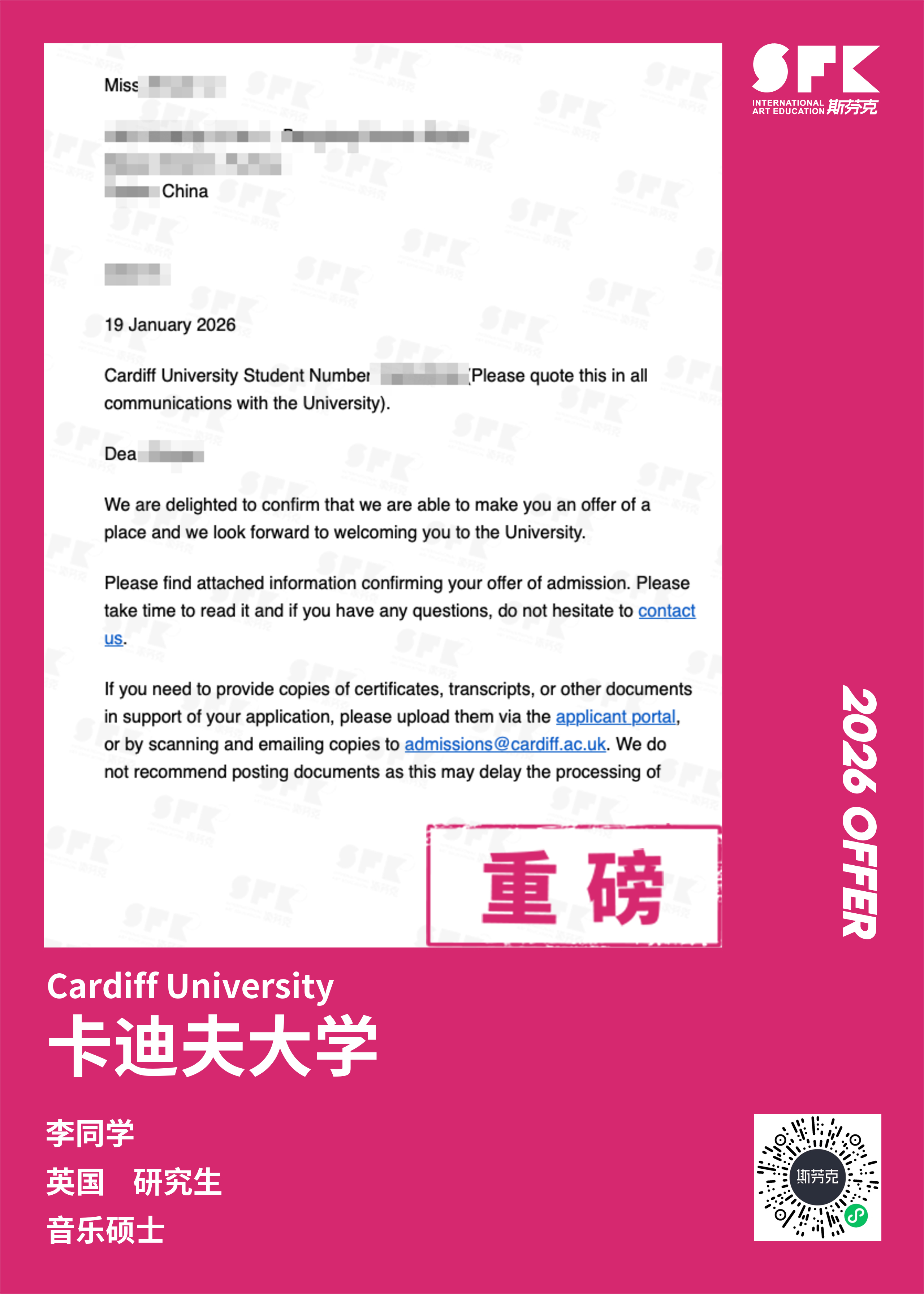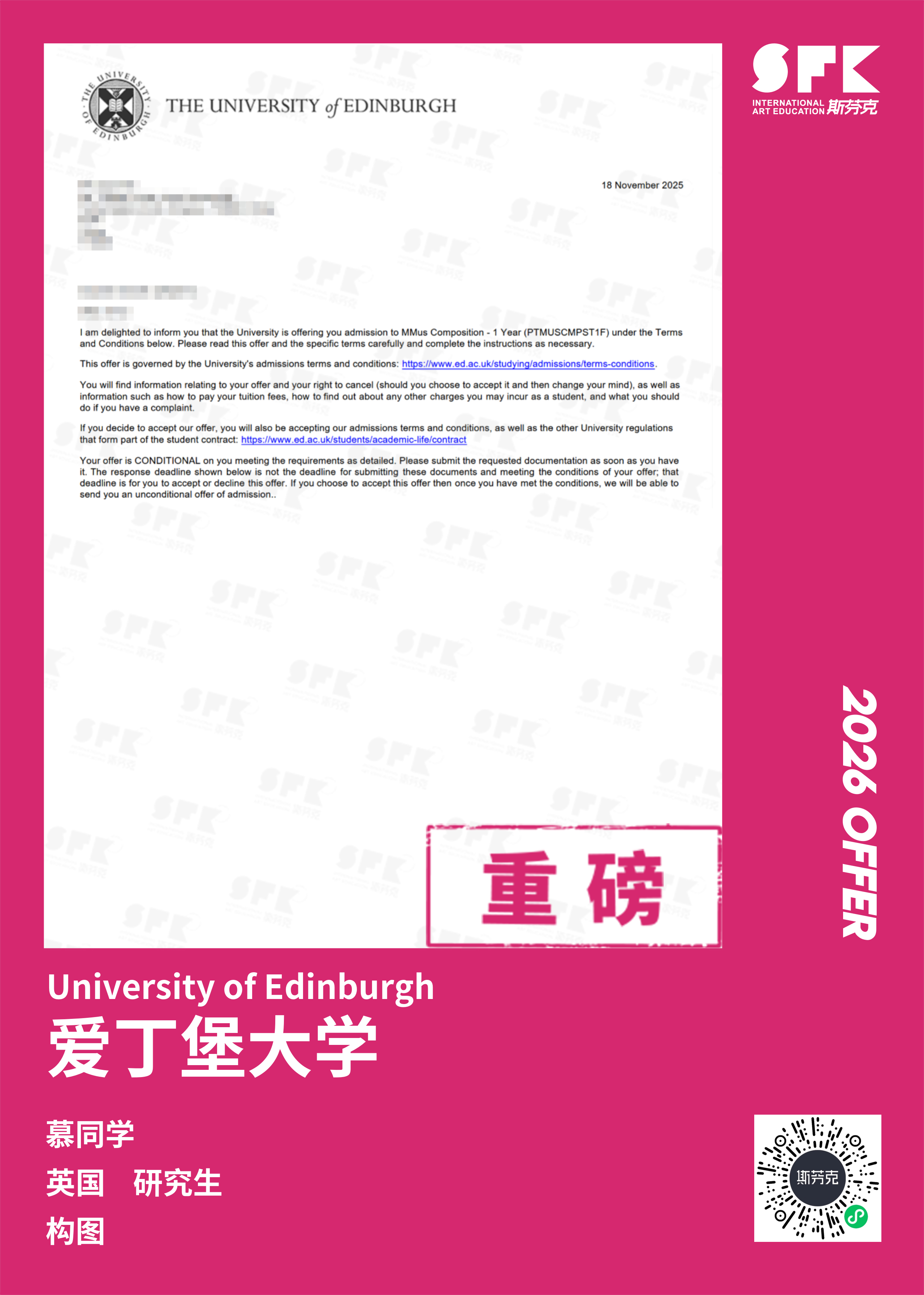 学生背景:MiraclE 22申请季 音乐科系学员 目前录取院校:皇家伯明翰音乐学院,约翰霍普金斯大学,爱丁堡大学,威斯敏斯特大学,伦敦大学金史密斯学院
