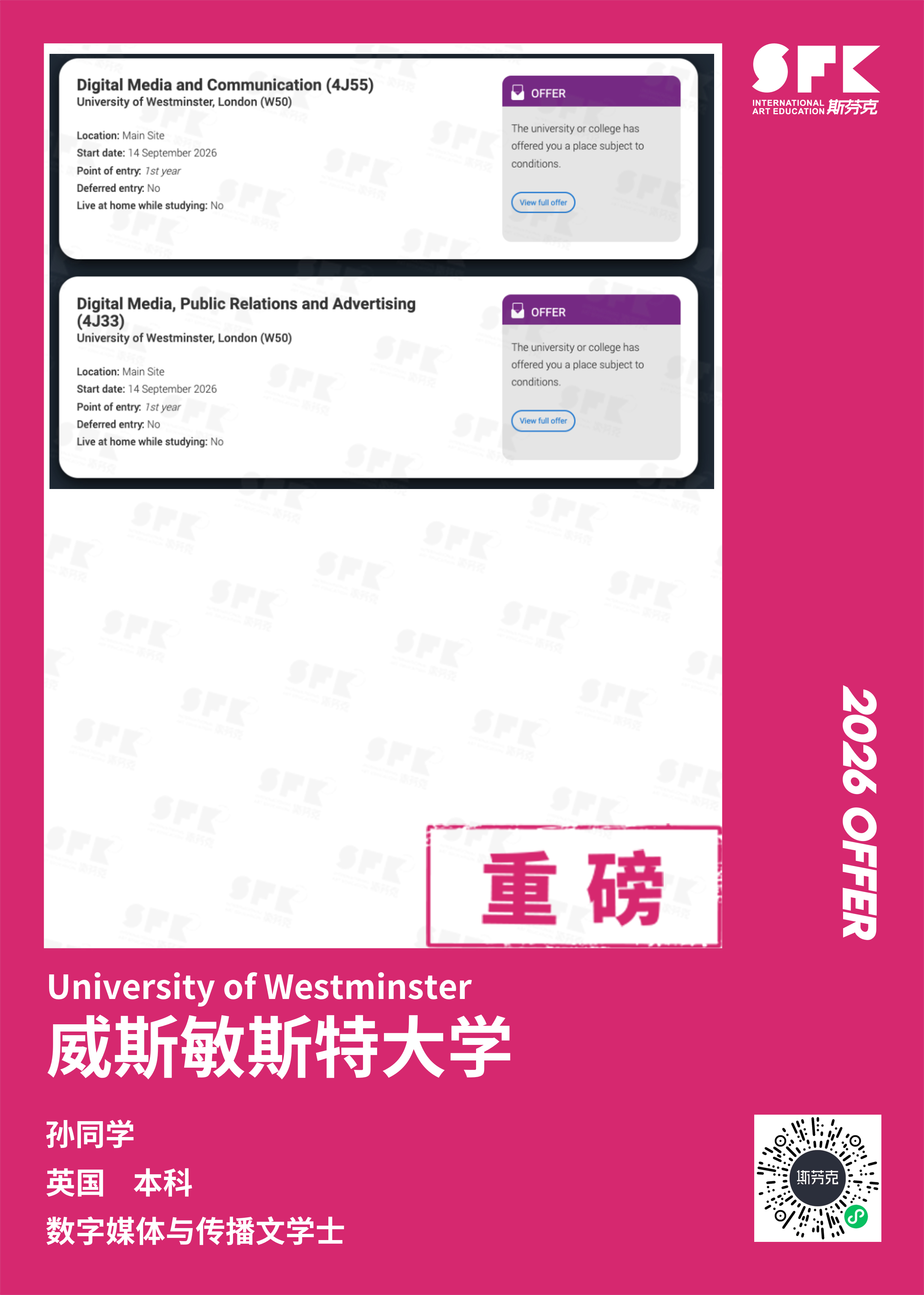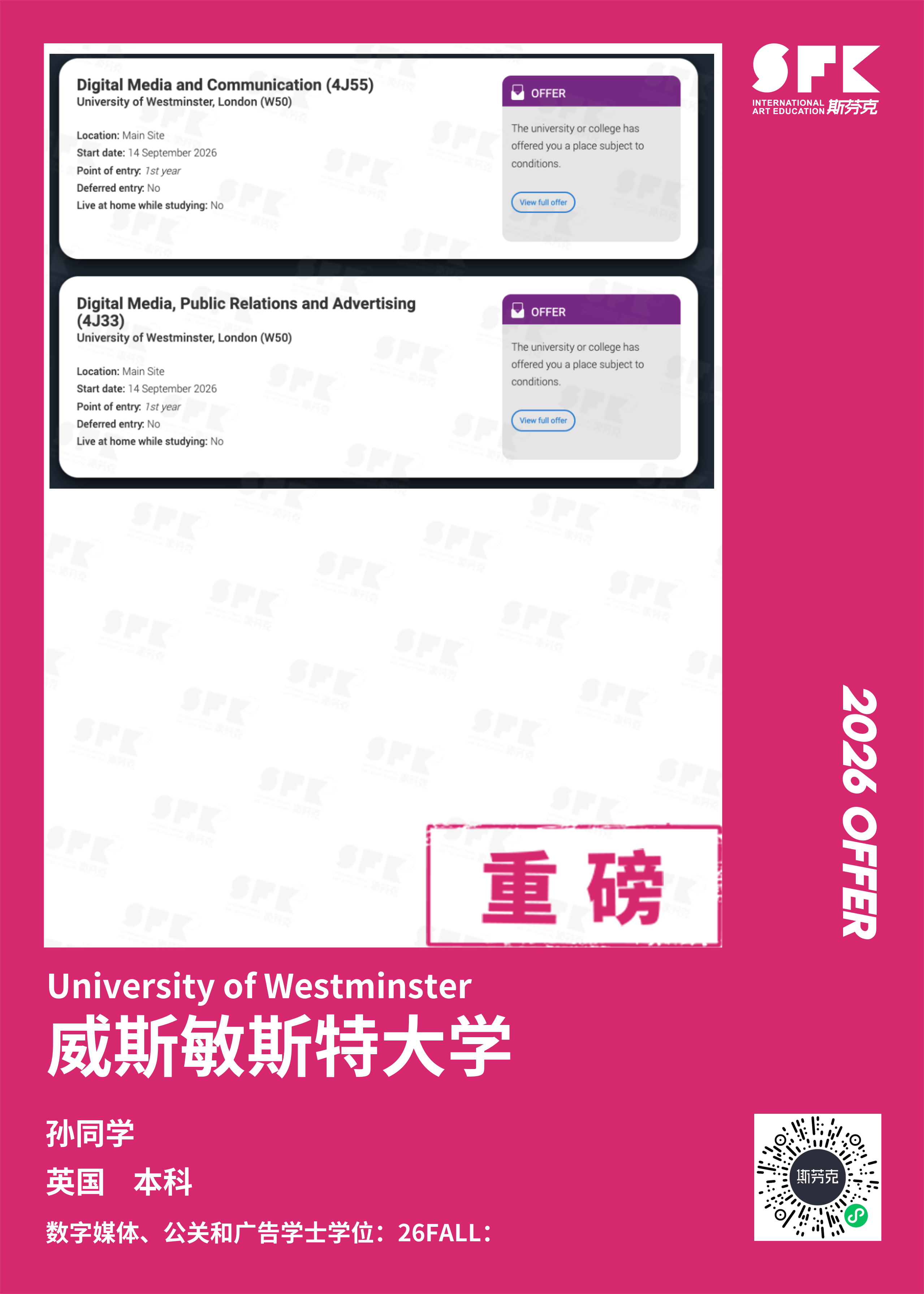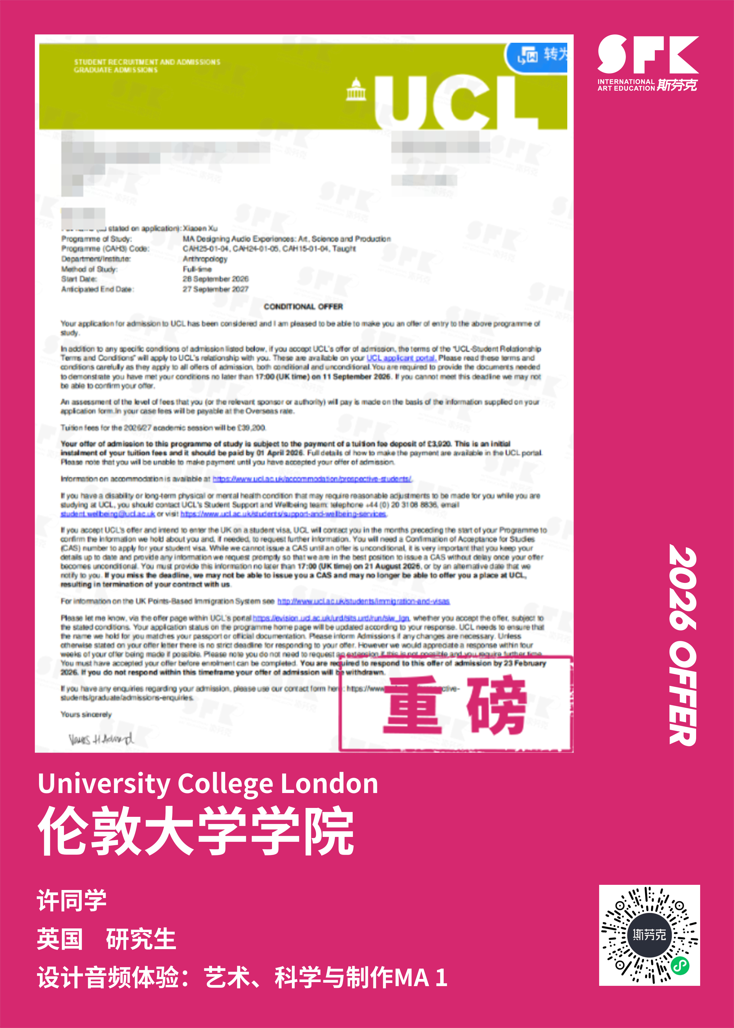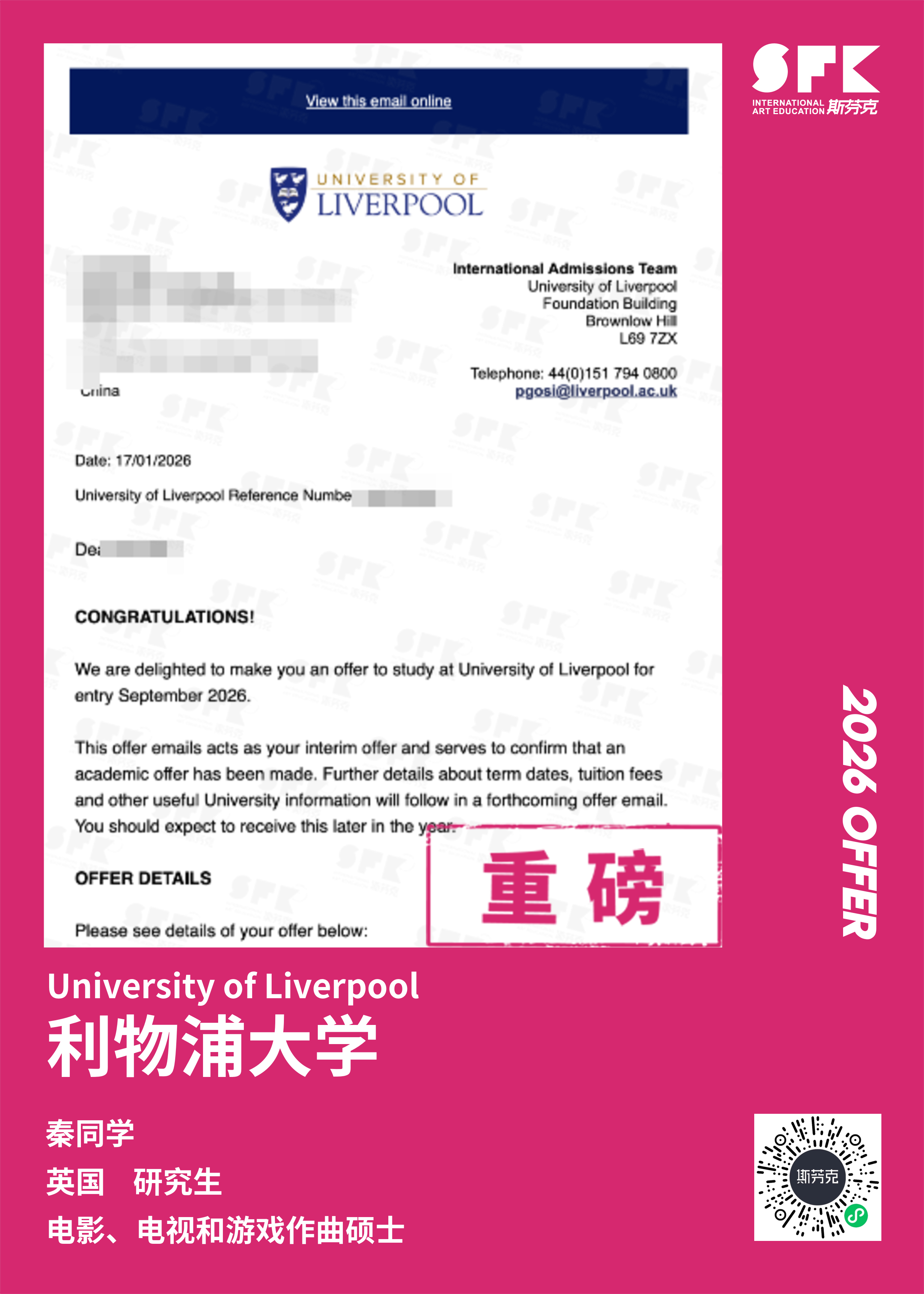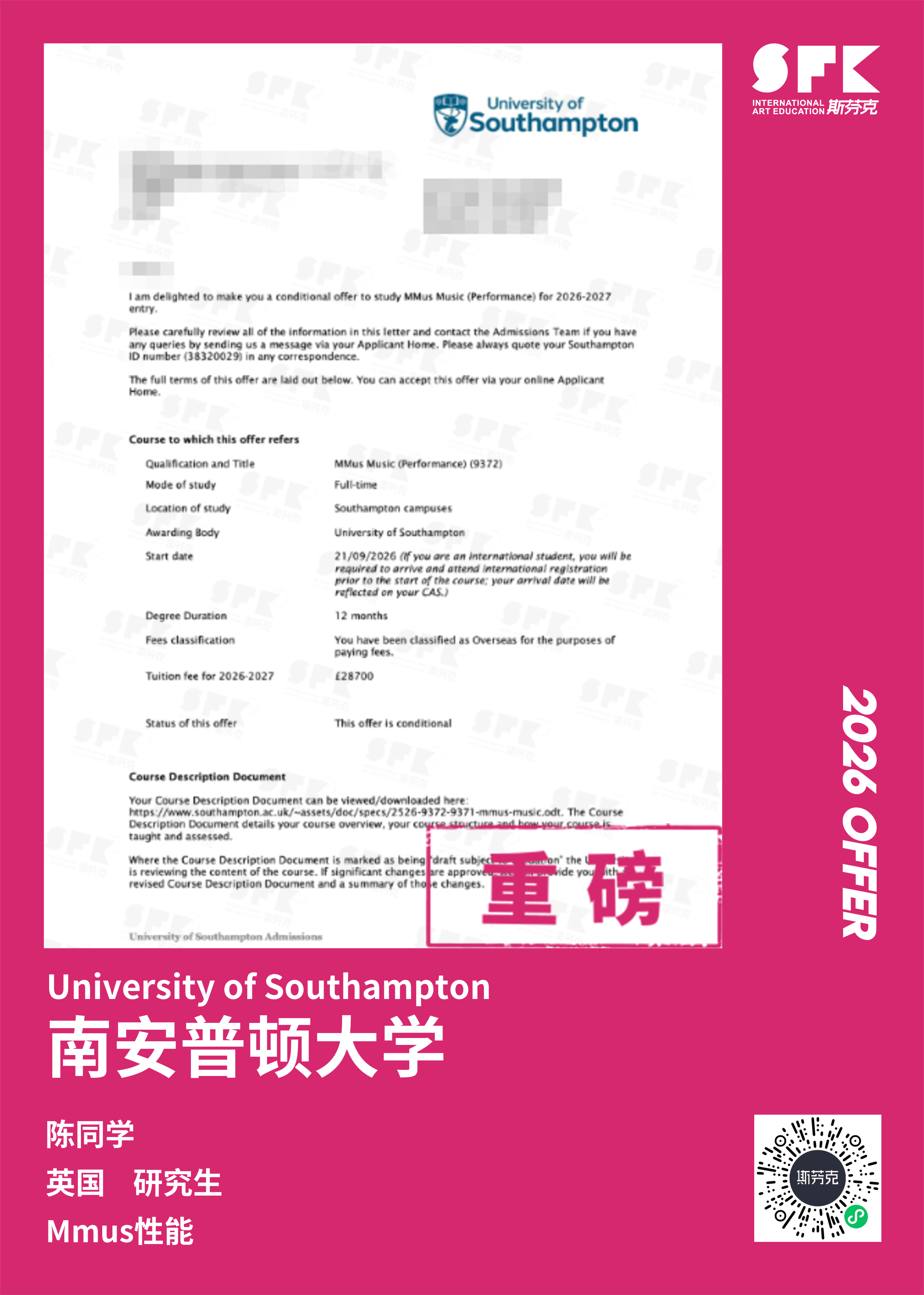学生背景:MiraclE 22申请季 音乐科系学员 目前录取院校:皇家伯明翰音乐学院,约翰霍普金斯大学,爱丁堡大学,威斯敏斯特大学,伦敦大学金史密斯学院